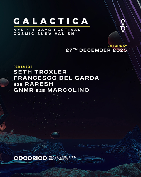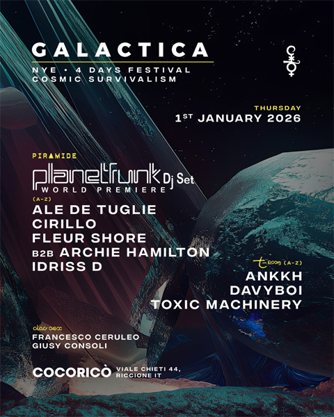 The four-day festival Galactica returns to Riccione to ring in the new year with leading artists from the international electronic scene.Featuring: Planet Funk (World Premiere Dj set), Seth Troxler, Raresh, Holy Priest, Fantasm and many more.