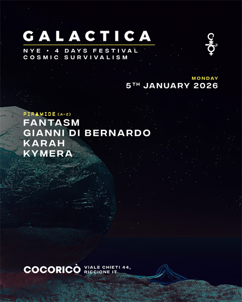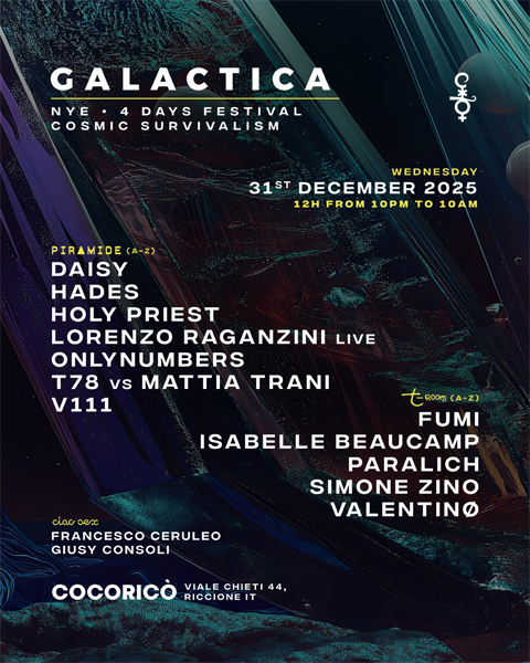 Returning from 27 December — once again spanning a full four days — „Galactica NYE“ brings back the festival dedicated to the very best of Italian and international electronic music, celebrating the end of 2025 and the start of 2026. The event, produced by Cocoricò, will take place entirely inside the iconic Cocoricò in Riccione, the pearl of Italian Riviera.