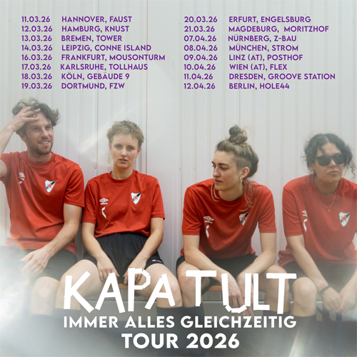 Leistungsdruck, Crushs und Datingsituationen, Einsamkeit, Überforderung, Unsicherheiten, Ängste – wohl kaum eine deutsche Band schafft es, diese Themen in so locker-flockige Indiepop-Hooks zu packen wie Kapa Tult aus Leipzig, gleichzeitig aber staubtrocken und roh, intim und grungy zu klingen.