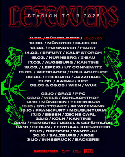Gleich im März starten LEFTOVERS zum ersten Tourabschnitt in Deutschland und der Schweiz, es folgen zahlreiche Termine in Österreich, diverse Festivals und – zweifellos das Highlight im Sommer – 5(!) ausverkaufte Stadion-Shows im Vorprogramm von DIE TOTEN HOSEN („Trink aus! Wir müssen gehen“ -Tour), inklusive dem Tourabschluss im Ernst Happel Stadion in Wien.