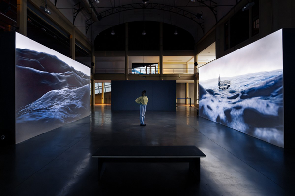 Conceived as a reflection on cyclical time and socio-political forces, the work reinterprets water as a metaphor for historical transformation and instability. Visitors are positioned between two monumental projections—a Chinese aircraft carrier and a tsunami—engaged in a dynamic visual and sonic exchange.