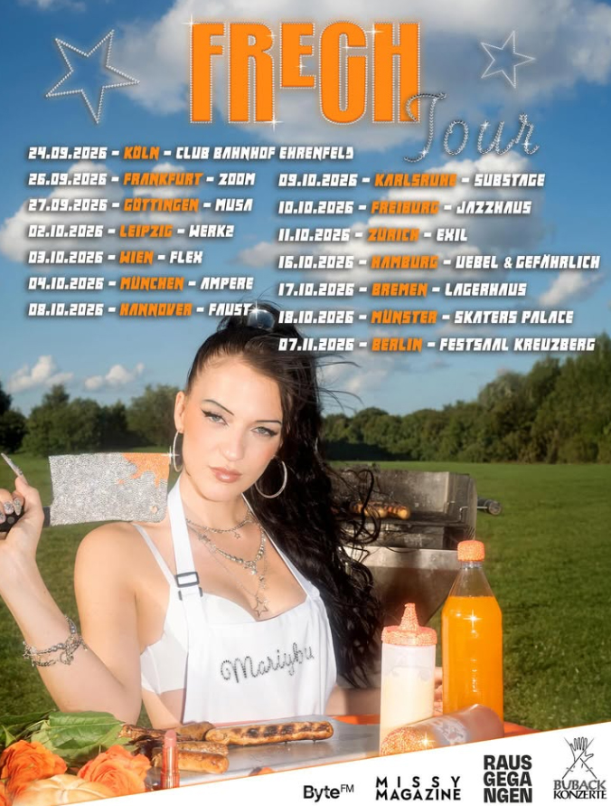 Die selbsternannte Bitch dreht den Spieß um und lässt grenzüberschreitende Cis-Männer von ihrer eigenen Medizin kosten, treibt es ironisch auf die Spitze à la #meninfemalefields und ballert mit ihrer F0dsengang im Crashout-Modus eine Hymne nach der nächsten. Die Berliner Hyperpop-Ikone produziert und schreibt außerdem komplett selbst, gilt als Pionierin des brandaktuellen Genres Fotzenmusik und hat mit ihrer Single “Kein Ponyhof” nicht nur einen neuen Style etabliert, sondern auch ihre künstlerischeIdentität ein für alle Mal zementiert. Das neue Album “FRECH” markiert diesen Meilenstein mit neun weiteren Songs und erscheint über ihr eigenes Label TangaTunes passenderweise am Herrentag, dem 14. Mai 2026.
